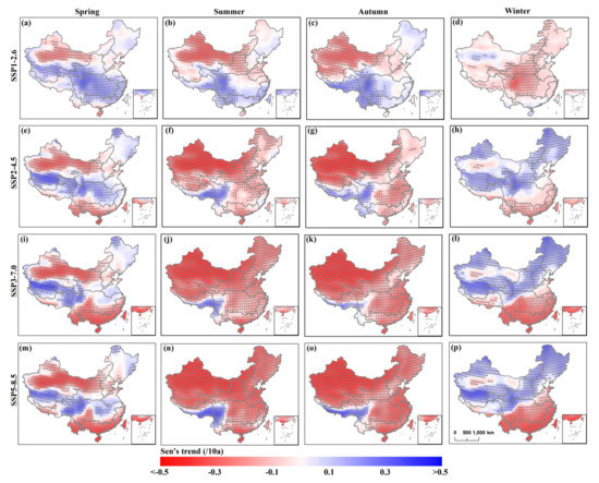 Spatial patterns of the SPEI03-based drought trend in (a,e,i,m) spring, (b,f,g,n) summer, (c,g,k,o) autumn, and (d,h,l,p) winter across China under the (a–c) SSP1-2.6, (d–f) SSP2-4.5, (g–i) SSP3-7.0, and (j–l) SSP5-8.5 scenarios for the future period (2015–2099). The SPEI03-based drought trend was calculated using Equation (7) across China. Gray dots indicate significance at a 99% confidence level using the Mann–Kendall method. Among them, the division of seasons is consistent with Figure 7.
