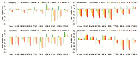 Compared with the historical period (Figure 13), it is expected that the drought trend in summer and autumn will be consistent with the historical periods across China under the medium-high and higher emission scenarios. In spring, wetting trend is a trend that will occur in the YZRB and HRB under most scenarios. Under most scenarios, a more serious drought trend in summer is expected to occur in HARB and HURB, and the drought trend is expected to increase by 2.9–5.7 times and 1.1–4.2 times, respectively. It is worth noting that the drought trend of most sub-regions is weaker than that in historical periods in autumn. However, the drought trend remains serious. In winter, a weaker drought trend is expected to occur in the YZRB. There is a higher change trend across China that corresponds to the higher emission scenarios, and the drought trend in summer and autumn is more serious than that in spring and winter.