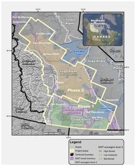 The nearly 400,000 km2 study area is mostly located in the NWT portion of the Taiga Plains Ecozone (Figure 1). The MVI project initially encompassed much of the High Boreal and Mid-Boreal ecoregions [29] in the southern part of the Taiga Plains (also known as Phase 1, ~151,700 km2, Figure 1), which include forests with potential for both business and community-based development. In 2013, the project was extended further north to include more of the High Boreal Ecoregion and to add the Low Subarctic Ecoregion as well as transition areas at the fringes of the Taiga Shield/Cordillera (also known as Phase 2, 244,000 km2, Figure 1). Phases 1 and 2 overlapped with 14 GNWT Forest Vegetation Inventories (FVIs) that already existed in the area (24% of Phase 1, 4% of Phase 2). These aerial photo-interpreted FVIs are of wide-ranging vintage, from the 1970s to the 2010s. The Taiga Plains is a 550,000 km2 area of low-lying plains, half of which are peatlands and one-fifth of which is water, centred on the Mackenzie River, Canada’s longest river, called Dehcho by the Dene, the original people of this region. It has short, cool summers with a mean temperature in July around 15 °C and long, cold winters with a mean January temperature around −25 °C. Precipitation is low to moderate, averaging 250 to 500 mm per year [29]. Snow and ice cover persist for 6 to 8 months a year. The Taiga Plains contains diverse forest stand conditions, ranging from wet open stands of black spruce (Picea mariana (Mill.) Britton, Sterns & Poggenb) occasionally interspersed with tamarack (Larix laricina (Du Roi) K. Koch) and medium closed stands of jack pine (Pinus banksiana Lamb.), to closed mixedwood stands dominated by aspen (Populus tremuloides Michx.), poplar (Populus balsamifera L.), and black or white spruce (Picea glauca (Moench) Voss) [29] (see Figures 2 and 3 in van der Sluijs et al. [12]).
