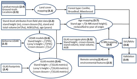 A schematic representation of the methods followed by the MVI project is shown in Figure 2. The 7 stand-level attributes were estimated in each 30 m forest cell within the study area, and the resulting stack of 7 maps is the Satellite Vegetation Inventory (SVI). Information on broad forest type came directly from the landcover map (see Section 3.2). To circumvent the scarcity of field data, as proposed by Mahoney et al. [8], thousands of surrogate FI plots scattered across the project area were created out of selected GLAS footprints with forest attributes estimated using nested models based on ALS data (Section 3.3) and GLAS data (Section 3.4). Specifically, each surrogate plot is the 30 m cell corresponding to the centroid of a GLAS footprint. In that cell, stand height, Lorey’s height, and crown closure attributes were computed as functions of GLAS waveform metrics (Section 3.4). These GLAS models were calibrated using a small set of 43 GLAS footprints that coincided with the 2007 ALS data, where the latter were used to derive an “observed” value of the forest attributes in each of those footprints. The “observed” values were derived from ALS-based models that, in turn, were calibrated with the 38 ground-measured FI plots that had ALS data (Section 3.3). The GLAS surrogate FI plots (Section 3.5) were then used as a reference dataset for the k-NN machine learning algorithm, which used a set of wall-to-wall remote sensing and environmental rasters as feature variables to select the most similar GLAS plots to each target pixel (Section 3.6). The value at the target pixel of the forest attributes was estimated as the mean value in those GLAS plots. An exception was stand age, which was estimated as a power function of k-NN predicted stand height (Section 3.7). Once the SVI was created, it was conflated into a single polygon layer (the MVIv) through a spatial generalization process (Section 3.8). The products were validated using independent data (Section 3.9). Further details on specific methodological steps follow.