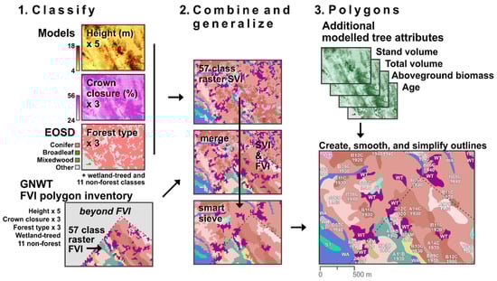 Overview of the spatial generalization of the raster maps into polygons in the vector version of the Multisource Vegetation Inventory produced in this study (MVIv). The dashed grey line in the lower insets represents the virtual seamline between the Forest Vegetation Inventory (FVI) and the Satellite Vegetation Inventory (SVI), which does not exist in the final vector product. For forest polygons, the first letter in the label indicates the crown closure class, the next 2 digits are the mean stand height, the last letter is the broad forest type, and the 4 digits below are the origin year (e.g., B11C means a conifer stand of 11 m height and crown closure class B–26%–55%). EOSD is the Earth Observation for Sustainable Development of Forests; GNWT is the Government of the Northwest Territories.