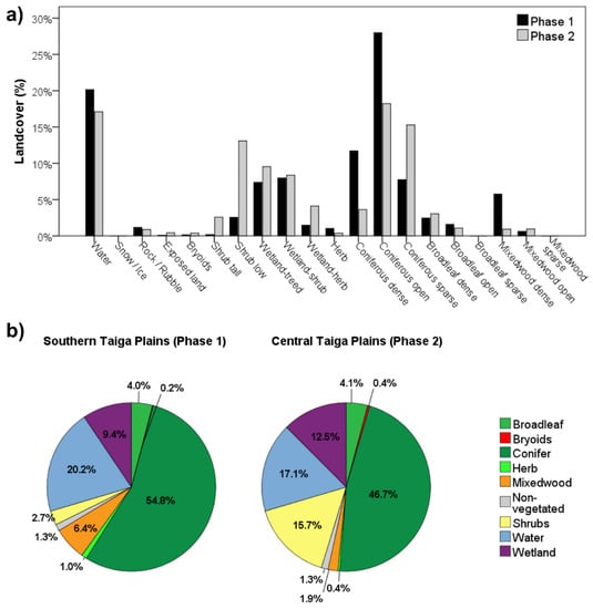 Histogram of the mapped landcover classes for two levels of classification detail: (a) level 5 (vegetation type plus density; 17 classes), and (b) level 4 (vegetation type; 9 classes), for Phases 1 and 2 of the MVI project, roughly corresponding to southern and central Taiga Plains, respectively.