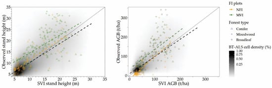 From all of the validation analyses presented in the Supplementary Materials, it appears that the produced rasters provide reasonable estimates of all six attributes given the uncertainties associated with the remote sensing data and the paucity of ground data in the region. The probability-based design of the NFI survey allows us to affirm with great (95%) confidence that, for example, stand height was underestimated by, at the most, an average of 4 m for the 30 m forest cells and that the mean pixel-wise absolute error was at most 4 m or up to 26% of the mean stand height in Phase 1, and 24% in Phase 2 (Section S4.1). Comparison with other independent datasets (unused GLAS footprints (Section S4.2), other ALS data (Sections S4.3–S4.5), and the GNWT FVI (Section S4.6) suggest that these errors may be closer to the lower confidence interval limit than to the upper limit. Overall, the SVI estimates were reasonable for both stand height and crown closure in open conifer stands, which occupy almost 60% of the forested area within the study area. Estimates of all forest attributes were within many reported estimates predicted using ALS data [41]. The poorest estimates were for dense deciduous stands; however, they cover <5% of the forested area within the study area. There was high variability in volume and biomass estimates, with decreasing accuracy in both low (overestimation) and high (underestimation) biomass stands. Although the bias and mean absolute error were lower in Phase 2 than in Phase 1, the relative errors were larger, and the agreement with the reference datasets was more spatially inconsistent. Stand age, which was estimated as a function of stand height, performed surprisingly well in Phase 1 (%RMSE of 35%, or 31 years), but not in Phase 2, where the underestimation bias could be as much as 90 years, owing to the lack of tree ring data in Phase 2 where trees can be very old and still have a low height. In general, error in Phase 2 is likely attributable to the lower mean stand height found in Phase 2, which poses challenges for GLAS height estimation. When estimates are compared with observed values in field plots and lidar plots (Stand height and AGB shown in Figure 6; other attributes show similar patterns), trend lines closely follow the 1:1 line for NFI plots and LiDAR plots from the Boreal Transect (Section 2.5), with a slight overestimation for low values and underestimation for high values. However, for the MVI plots, which were selected for modelling purposes and where the more productive stands are overrepresented, the trend line is on the underestimation side across all the ranges, which is unsurprising given their values are above the regional average. Further observations on the validation results are available in the Supplementary Materials.