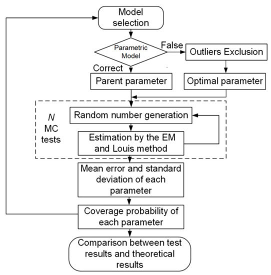 Figure 3 shows the MC simulation procedure. The top loop determines the model type. For each class of models, 2500 independent samples are generated. The mean values and standard deviations of each parameter estimation in the MC simulation are obtained. The nominal confidence level is 95%. Then the coverage probability, namely the probability of the true value falling into the stipulated confidence level, is determined. Finally, the sample type is replaced and the process is repeated until all simulations are accomplished.