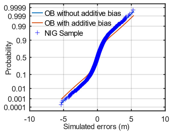where represents the summary of the impacts of model errors and statistical uncertainty. Figure 4 shows the CDFs of the overbounds with and without additive bias, providing that the distribution of the samples obeys the NIG distribution. The y-axis is scaled by the standard Gaussian distribution to explicitly show tails. After adding the additive bias, the function better overbounds the distribution of simulated samples.