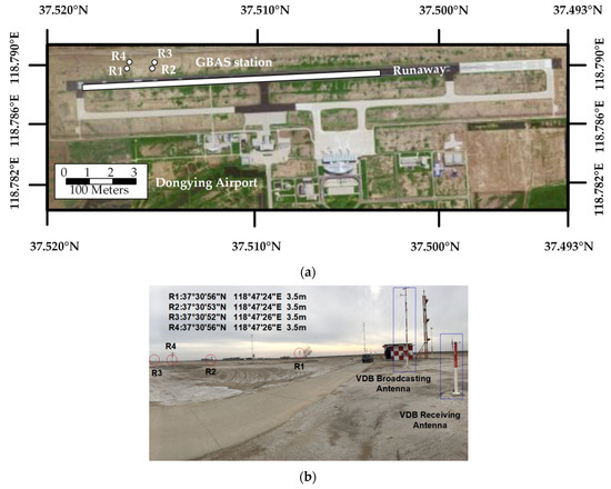 (a) Top view of the Dongying Airport environment. (b) Locations of the experimental equipment deployed at the airport.