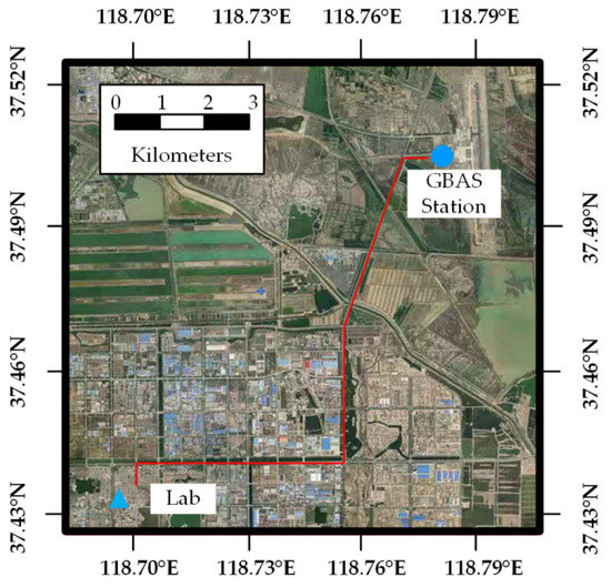 To assess the performance of the VPLs based on the proposed overbound in the real environment, a road test was carried out near the GBAS station on 25 January 2021. A receiver deployed in a land vehicle that collects the BDS data at a frequency of 0.5 Hz is assumed to be the dynamic user. The location of the GBAS station and the reference trajectory of the vehicle are illustrated in Figure 7. The experiment was repeated three times along this trajectory. To prevent the influence of nonline-of-sight signals, only seven satellites whose visibilities remained unchanged during the overall process were selected. These satellites included four GEO satellites (C01, C02, C03 and C04) and three IGSO satellites (C06, C09 and C10) [47]. In addition, the test vehicle was furnished with a receiver as the user receiver, along with another receiver in the lab as the base station to conduct real-time kinematic (RTK) positioning. The RTK solutions minus the Ifree position results are assumed to be the actual errors for the entire road test.