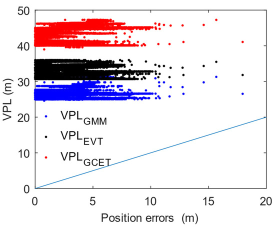 Due to its low level of freedom and conservative core, the Ifree filtering algorithm increases Gaussian overbounds by 2.6 or more when receiving L1 and L5 GPS signals. The same situations apply to Ifree-based GBAS when receiving B1C and B2a BDS signals. The VPLs are too conservative, implying a high probability of exceeding prescribed alarm alerts. Then, a false alert is triggered, and availability is lost. Conversely, for GMM overbounds, although some items with large variances exist in FGMMOB,v, the corresponding coefficients are quite small and far lower than the integrity risk, thus having little impact on the final VPLs. Therefore, it can be foreseen that the Ifree-based VPLs based on a GMM are not as conservative as those based on the Gaussian method.