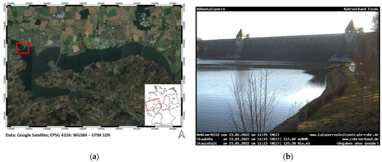 In this study, the Moehne Dam, located in the east of the state North Rhine-Westphalia in western Germany, was investigated. The location is shown in Figure 1a.
