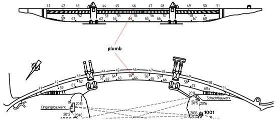 Figure 3. Spatial distribution of the trigonometric measurements (Object Points—OP) across the Moehne Gravity Dam. The 27 Object Points are numbered from 41 to 67 [2].