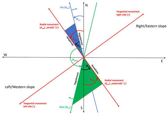 while Arad represents the given radial angle from the Ruhrverband. Then, αa can be used to transform the horizontal deformations (dhor) from the satellite’s ascending axis into the radial movement axis (drad) by applying