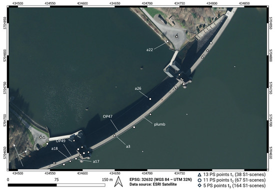 A total number of 29 PS points was identified along the Moehne gravity dam, utilizing all three Sentinel-1 data stacks mentioned in Table 1. Furthermore, Figure 6 displays the location of all 29 PS points and their respective Sentinel-1 data stack. The positions of the PS points presented in the following subsections (a3, a17, a18) are marked as well. Within these three stacks, the highest number of PS points was identified using the stack with the lowest number of scenes and vice versa. Hence, 5 out of 29 PS points were detected using the data stack t3, which contains 164 Sentinel-1 scenes, 11 points were detected using t2, which contains 67 Sentinel-1 scenes, and 13 PS points were detected for the data stack containing 38 Sentinel-1 scenes. The PS points show different locations depending on the data stack, although most detected PS points are located on the dam crest with a significant accumulation near the towers, for all stacks. A small number of PS points are located at the lower parts of the dam and a few points lie further away from the dam.