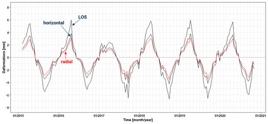 Deformations were estimated for all 29 identified PS points, and LOS deformation was converted into horizontal and radial displacements according to Section 2.3. Furthermore, Figure 7 demonstrates the impact of the use of the precise dam model in order to compute the radial deformations. Maximum values, as well as minimum values, turn out to be less robust, whereas the seasonal pattern remains. In particular, the transition from LOS deformations into horizontal deformations causes the maximum and minimum values to reduce by up to 2 mm. The same effect can be observed for the computation of radial deformations. Here, maximum values and minimum values reduced by up to another 0.5 mm. The deformations regularly follow a seasonal pattern for all points. This pattern is shown in Figure 7 by the example of one PS point. In spring, the radial deformations generally reach a maximum of up to 3 mm, whereas a decline in the following months can be observed, reaching a minimum during late summer of up to −3.5 mm. Solely in 2017, the maximum values of radial deformation reached only about 1.2 mm in April. This seasonal cycle could be observed for all points that are located on the dam crest. The PS points that are located on the lower parts of the dam or near the outer parts and near the slopes contain the same seasonal pattern, but with significantly lower maximum and minimum displacement values.