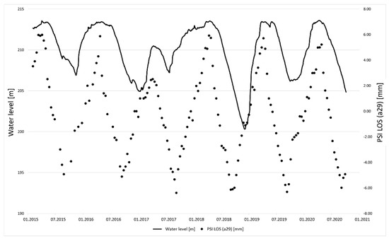 Figure 7. The seasonal pattern of the PSI measurement, as well as the water level, are similar to each other. This connection is confirmed by an r2 of 0.56. Therefore, it is evident that the water level and subsequently the water pressure is the driving force of the deformation, although other factors may also have a more limited impact on the final deformation.