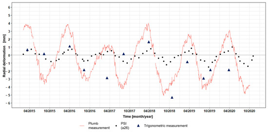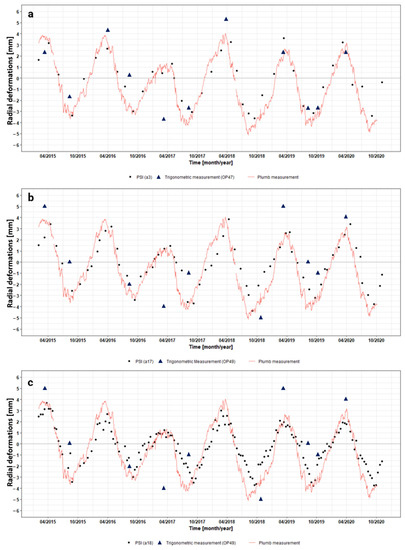 The radial deformations were visually and statistically compared with the in situ measurements. Figure 9 illustrates the annual deformation rates for three single PS points, one out of each data stack, respectively. Additionally, plumb measurements and trigonometric measurements of the nearest measuring point are included. Since plumb measurements resolution is on a daily basis, the seasonal cycle can be tracked very simply.