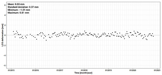 As a further measure to evaluate the intrinsic accuracy of the technique, the statistical parameters of PS points that are clearly located far away from the dam, and for which no deformation is expected, can be considered. An example of PS 22 was provided in Figure 10. Additionally, the location of this point is given in Figure 6. It should be noted that these are the LOS values. Since their conversion to radial values is not useful due to their location outside the dam wall, the radial values are not shown. The points’ deformations have maximum ranges of 2.25 mm, compared to the range of 8 mm of the points situated on the dam. If no deformation exists at these points, these values can be used as another measure of the accuracy of the PSI technique. Thus, they indicate the basic uncertainty of the technique, which ranges around +/−1.2 mm. For this purpose, however, it should be ensured that no displacements or movements are actually present at these points, which could not be fully verified in this study.
