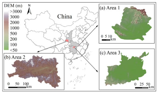 Locations of the study areas. (a) The first study area, Hubei Province. (b) The second study area, Shanxi Province. (c) The third study area, Hunan Province.