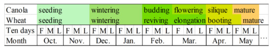 The phenological calendar of canola and winter wheat in those study areas was investigated, as shown in Figure 2. Canola and wheat were usually sown in October. Canola generally enters the flowering stage in May, when winter wheat enters the stem-elongation stage. In May, both enter the mature stage.
