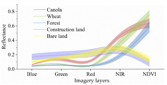 According to our observations, the yellow flowers of canola can create a visual difference between canola fields and winter wheat fields. The most spectral differences between yellow petals and non-yellow petals are visible in the green and red bands [46]. The content of carotenoids in the canola petal is very high; they absorb blue light and reflect green and red light [3]. At the vegetation canopy scale, the recorded spectral reflectance values came from the canola’s yellow flowers and green leaves and stems. The values from other crops, including winter wheat, came only from their green leaves and stems [11,47]. As a result, the spectral reflectance values of canola in the red and green bands were higher than those of other vegetation types during the canola flowering season. However, in the blue and NIR bands, the spectral reflectance values of canola and other vegetation types were similar.