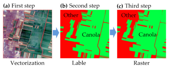 In the study, 45 validation quadrats with dimensions of 0.5 km × 0.5 km were randomly selected. Three steps were taken to complete the production of those validation quadrats, as shown in Figure 4. First, the boundaries of various ground objects within each validation quadrat were manually plotted in accordance with Google imagery with a spatial resolution of 0.1 m × 0.1 m. Second, the vector data attributes for different ground objects were determined and labeled from field-based survey data. The canola fields were labeled as “canola” type, and all other ground objects were labeled as “other” type. Third, the vector data were converted to raster data, and their spatial resolution was converted to 10 m, the same as the classification results. Those raster data were regarded as the ground-truth samples. Then the confusion matrix accuracy verification method [43,44] and F1 score [45] were used to verify the classification accuracy. The confusion matrix accuracy parameters included overall accuracy, production accuracy, user accuracy, and the kappa coefficient.