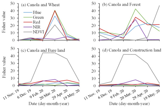 Note that March is the flowering period for canola. In Figure 5a, on 20 March 2020, the Fisher values between canola and wheat in the blue, green, and red wavebands reached the peak values of 33.02, 40.75, and 40.21, respectively. Those values were approximately seven times higher than those in other periods. The Fisher values between canola and wheat in the NDVI layer also reached a peak value of 20.95 on 20 March 2020. For the NIR band, the Fisher values between canola and winter wheat were low throughout the growth period, fluctuating around 2.86. In Figure 5b, the green and red wavebands still performed well in distinguishing canola from forest, and their Fisher values were 42.58 and 31.31, respectively, on 20 March 2020. The Fisher value on the blue waveband was 18.74. As shown in Figure 5c,d, the NDVI image had an absolute advantage in identifying canola on 20 March 2020 compared to the four wavebands. Because the Fisher values of the NDVI were greater than 40, whereas the Fisher values of the four wavebands were less than 10 on 20 March 2020. Those results demonstrated that the blue, green, and red wavebands, and NDVI layer of the Sentinel-2 image on 20 March 2020 had the best potential to identify canola.