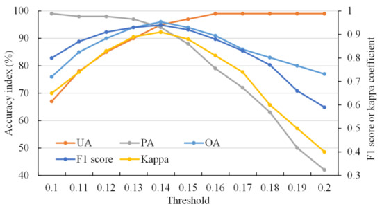 According to histogram statistics, the preset threshold to distinguish canola and non-canola on the CFI images was 0.15. Then accuracy curves were drawn corresponding to various candidate thresholds, as shown in Figure 6. As the threshold increased from 0.1 to 0.2, the UA increased while the PA reduced. Other accuracy indicators showed a trend of increasing first and then decreasing, reaching a peak value when the threshold was 0.14. Therefore, it was believed that 0.14 was the best threshold of the decision tree model based on CFI images for distinguishing canola from other ground objects.