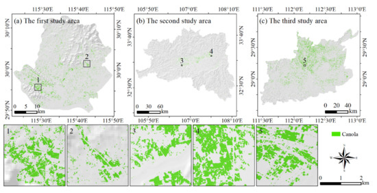 Canola (Brassica napus L.) is one of the major oilseed crops worldwide. It is the primary source of edible oil for human consumption and a biological feedstock for fuels [1]. Canola flowers are an important tourism resource, promoting the local development of tourism agriculture [2,3]. However, the production and consumption of canola are unbalanced in different world regions. For example, China’s domestic canola production is far less than its increasing demand for canola [2]. Mapping and tracking the unbalance in canola planting areas is of great importance for agricultural management and food security.