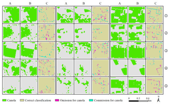 Note that when using the decision tree model to identify canola in the second and third study areas, new training samples were not used. However, new training samples were used in the SVM method. That was because when using the SVM method as a classification system, the training samples produced on one image were difficult to apply to another image. In addition, the classification speed of the decision tree model was approximately 60 times that of the SVM method.
