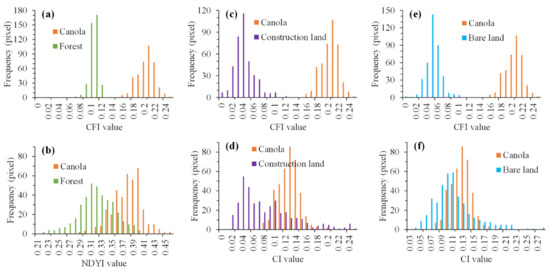 Histograms of various objects based on various canola flower indices. (a,c,e) Histograms of canola, forest, construction land, and bare land based on CFI values. (b) Histograms of canola and forest based on NDYI values. (d,f) Histogram of canola, construction land, and bare land based on CI values.
