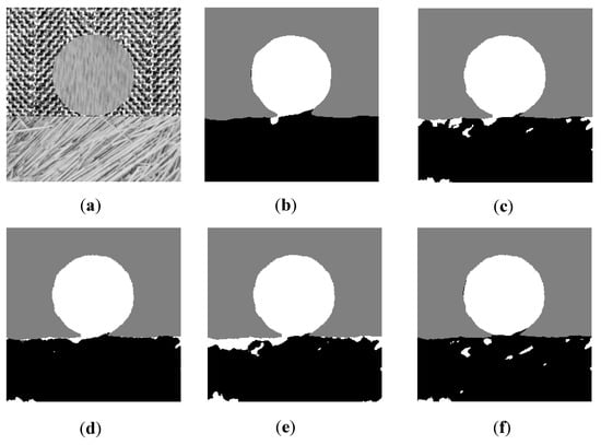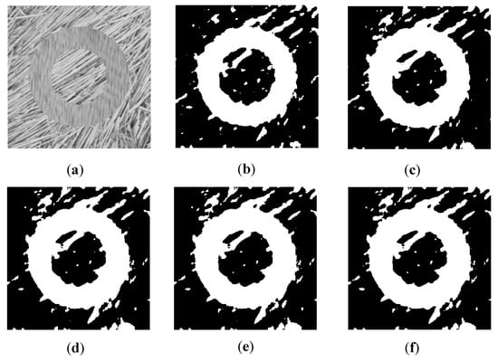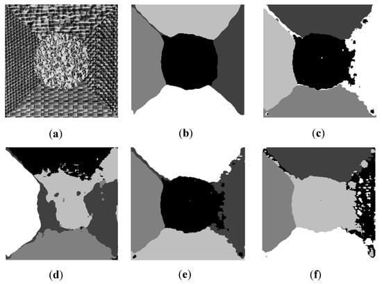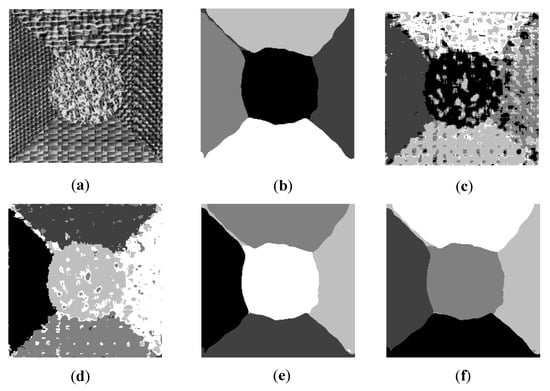 Six texture images are used to evaluate the performance of the proposed AFWDLMO. The texture structures are selected from the Brodatz texture library for each image ( pixels). Gabor features are dominant in Image1 and Image2, and GLCM features are dominant in Image3 and Image4. For Image5 and Image6, Gabor and GLCM features have similar performances on segmentation results, but Gabor feature is slightly better. The final segmentation results are visually shown in Figure 2, Figure 3, Figure 4, Figure 5, Figure 6 and Figure 7, where (a) is the original texture image and (b–f) are segmentation results of five algorithms. In Table 1, the integer column of AFWDLMO represents the feature weights obtained by the weight determination layer, and the best result in each row is highlighted.