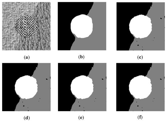 Segmentation results of five different feature weights on Image3. (a) original image; (b) the weight of weight determination layer; (c) ; (d) ; (e) ; (f) .