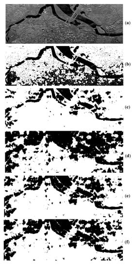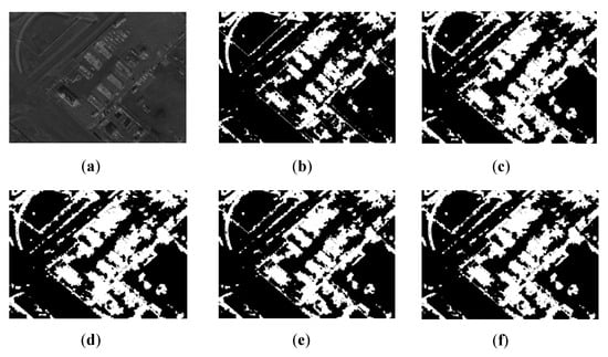 In Figure 14, SAR5 mainly contains two classes: lands (black regions) and buildings (white regions). AFWDLMO gives the best visual results and maintains the edge details of each building, while the other four algorithms give slightly worse results.