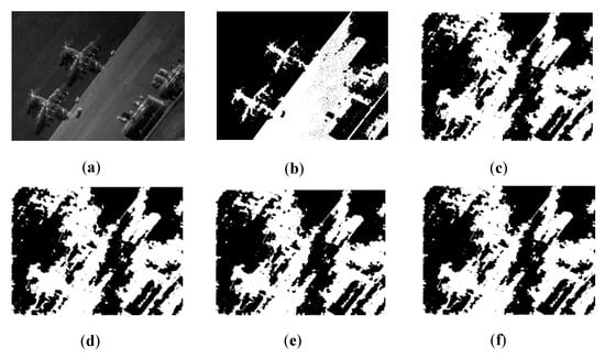In Figure 15, SAR6 can be classified into two classes: land (black regions) and airplane (white regions). Despite some mis-division existing in the results, AFWDLMO obtains a nice segmentation, which sensitively displays two airplanes on the left area and one airplane on the right area. The other four algorithms obtained the worst results, which show misclassification of large pixel blocks and can not maintain the details of airplanes. In addition, the split line (in the middle) is well seen in the result by AFWDLMO.