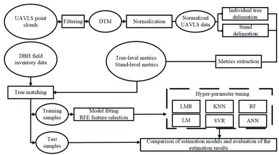 The whole process of developing the prediction models for DBH is shown in Figure 2. After pre-processing, both stands and the crowns of individual trees were delineated using the UAVLS data, after which a high number of metrics were calculated for the stands and trees.