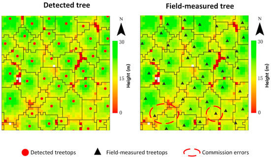 The algorithm segmented the CHM into different polygons, polygon boundaries representing the perimeters of individual tree crowns (Figure 3). The maximum elevation of each polygon indicated the treetop. Those LiDAR-detected trees that could be matched with field-measured trees were used to develop models for DBH. Those segmented trees that could not be matched with field-observed trees were either trees that failed to produce local maxima in the CHM, or they were local maxima that did not represent treetops (Figure 3). In total, 79% of the trees were detected with commission errors in 22% of the trees. Out of 4109 field-measured trees, 3815 trees were correctly matched and used in modeling.