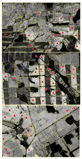 Stand delineation overlaid with the 95% percentile of the height distribution of the echoes (1 km × 1.5 km). A lighter tone indicates a higher value of the attribute. Red points represent sample plots and yellow lines are stand boundaries.