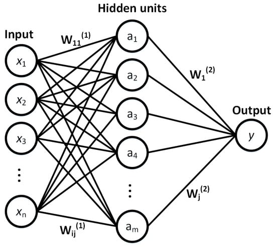An overview of the artificial neural network (ANN) method. Symbol x represents an input feature, Wij(1) are the weights of predictors (normalized LiDAR metrics) to calculate intermediate values, aj is the intermediate value (hidden layer value) of neuron j, obtained from the activation function, Wj(2) are the weights of the neurons in the calculation of the prediction, and y is the predicted DBH value. In this ANN, there is one hidden layer.