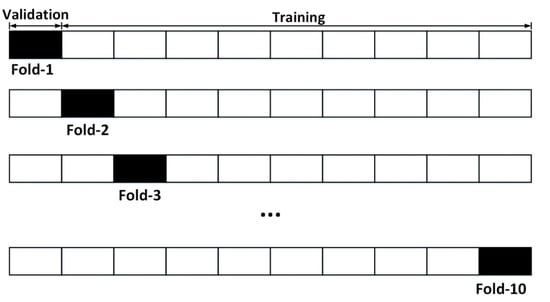 The recursive feature elimination (RFE) algorithm was used for feature selection [31]. The RFE is a greedy method for finding the optimal feature subset, which is specific for each method [38]. The optimal feature subset size was based on the performance of the model, which was evaluated by the root mean square error (RMSE) of a 10-fold cross-validation scheme. The training dataset was divided into 10 subsets (Figure 6). One sub-set was used for testing and nine were used for training. This was repeated 10 times, using every time a different training and test dataset. The results are the averages calculated for the 10 training and test sets.