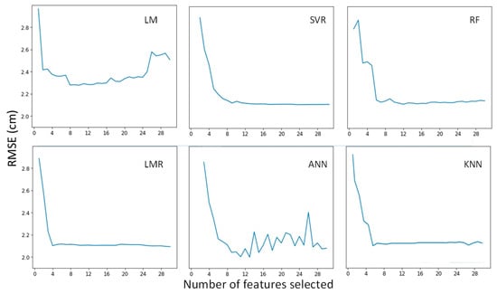 RFE was used to evaluate the effect of the number of input features on the model performance. The RFE algorithm is based on feature importance, where the relative importance of each metric is obtained by quantifying the increase in the mean square error of the model after the removal of the variable [34]. The optimal feature subset size was the one that minimized the average RMSE of the cross-validation scheme. The values of the hyper-parameters that were used in the feature selection step were taken from previous studies [8,11,17]: LMR, λ = 0.01; SVR, r = 0.0011, C = 64; RF, ntree = 400, mtry = m/3 (m is the number of LiDAR-derived metrics used in RF); KNN, k = 5; ANN, size = 1; ƞ = 0.6.
