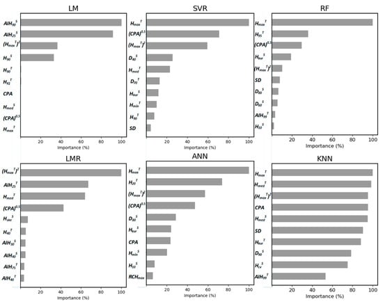 The most important LiDAR-derived metrics for estimating DBH were partly the same for the different methods (Figure 8). HmaxT (maximum point cloud elevation within the crown area of an individual tree) or its transformation (HmaxT)2 usually had the greatest relative importance.