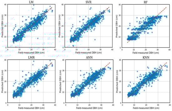 The predicted vs. field-measured diameter at breast height (DBH) in the independent validation data for six different prediction algorithms. The red line is the 1:1 trend line.