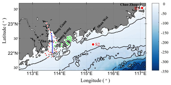Location of study area. The smaller red circles represent the stations of Pearl River estuary surveys in January 2003, January 2004, May 2004, August 2009, October 2009, November 2009, December 2009, February 2010, July 2010, 5 June 2012, December 2012, and blue circles represent the stations of Pearl River estuary surveys in November 2013; green circles represent the stations of Daya Bay surveys in 2016 and 2017; The relatively larger red circle with a sign ‘S2’ nearbyre presents the location of the water quality buoy GD3810.