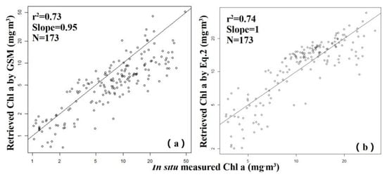 Comparison of the in situ measured Chl a and the retrieved Chl a by applying Equation (1) (a) and Equation (2) (b) respectively. The solid line corresponds to the 1:1 line.
