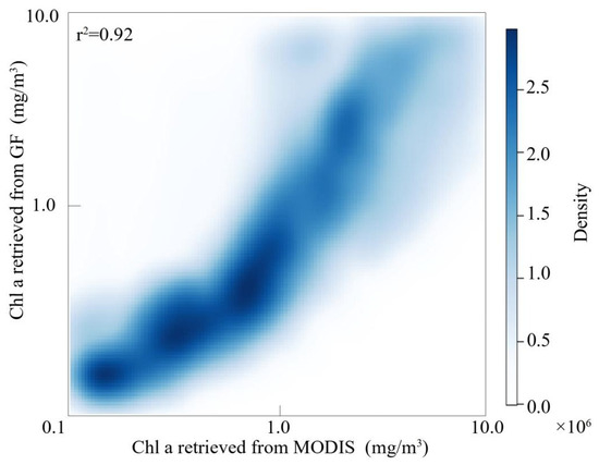 The comparison between the retrieved Chl a from GF-1 (by applying Equation (2)) and MODIS (by applying Equation (1)) on 8 January 2020. The color bar varies from pure white to deep blue, and indicates that the numbers of the pixels with the same value of the Chl a varies from 0 to 2.5 × 106.
