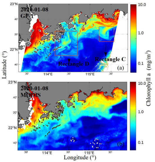 Comparison of the retrieved Chl a from GF-1 by applying Equation (1) and MODIS by applying Equation (2); (a) is the retrieved Chl a from GF-1 on 8 January 2020. (b) is the retrieved Chl a from MODIS on 8 January 2020.