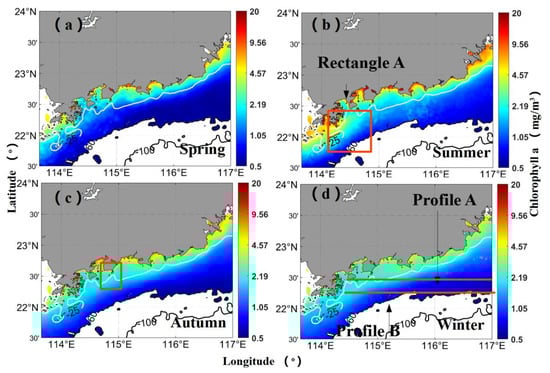The mean value of the Chl a (mg/m3) in four seasons from July 2002 to June 2020 (114.3–117°E; 21.6–24°N).