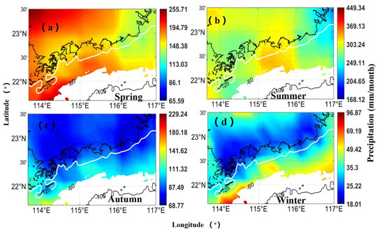 The monthly precipitation (mm/month) in four season from January 2003 to December 2019. (a) represents the mean Chl a in Spring; (b) represents the mean Chl a in Summer; (c) represents the mean Chl a in Autumn; (d) represents the mean Chl a in Winter.