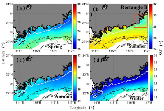 The mean Sea Surface Temperature (°) in four season from July 2002 and June 2020. (a) represents the mean Chl a in Spring; (b) represents the mean Chl a in Summer; (c) represents the mean Chl a in Autumn; (d) represents the mean Chl a in Winter.