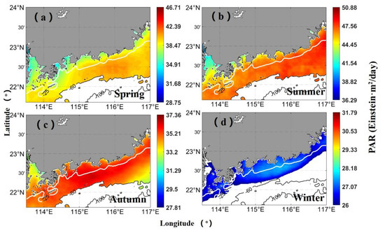 The mean PAR (Einstein·m2/day) in four seasons from July 2002 to June 2020. (a) represents the mean Chl a in Spring; (b) represents the mean Chl a in Summer; (c) represents the mean Chl a in Autumn; (d) represents the mean Chl a in Winter.