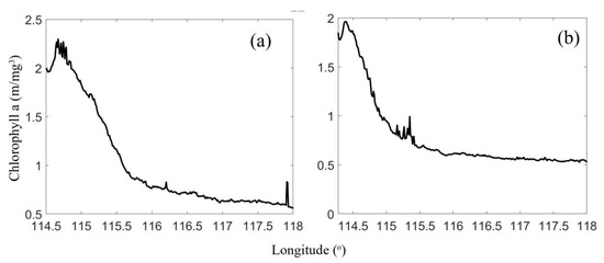 The horizontal distribution of the mean chlorophyll a (mg/m3) in the coastal waters in winter. (a) represents the horizontal distribution of the mean chlorophyll a at 22.2°N; (b) represents the horizontal distribution of the mean chlorophyll a at 22.4°N.